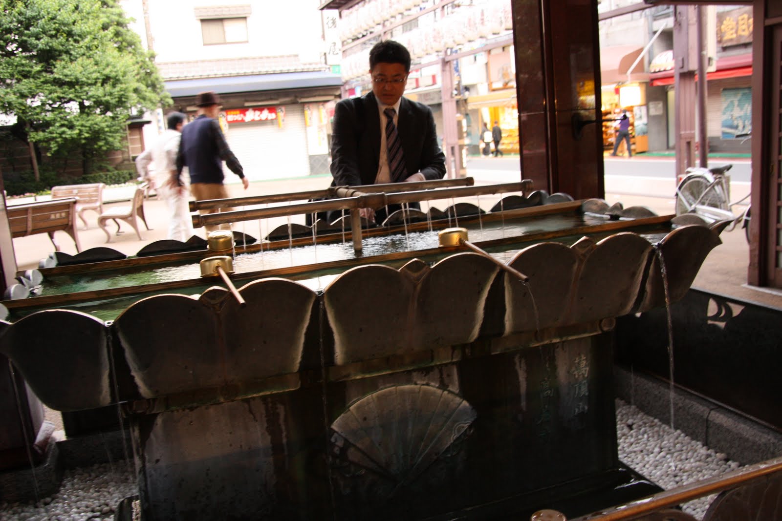 The temple is in a neighborhood, with lots of little shops that appeal to women of certain age (it’s sometimes called the grandmother zone). You cross into the percents, to find a Chouzuya, a place to wash. The stone basin here was sheltered under a small pagoda, with elegantly simple brass ladles. You scoop up some water with the ladle and wash your right hand, then your left, then pour a bit of water in your right hand, rinse your mouth and spit (discretely) onto the ground. The sheer abundance of the water is beautiful. It is reminiscent of the holy water fonts in Catholic churches (though most of those seem parsimonious compared to this flowing water, so rich visually and aurally), and of the places to wash your feet before entering a mosque.